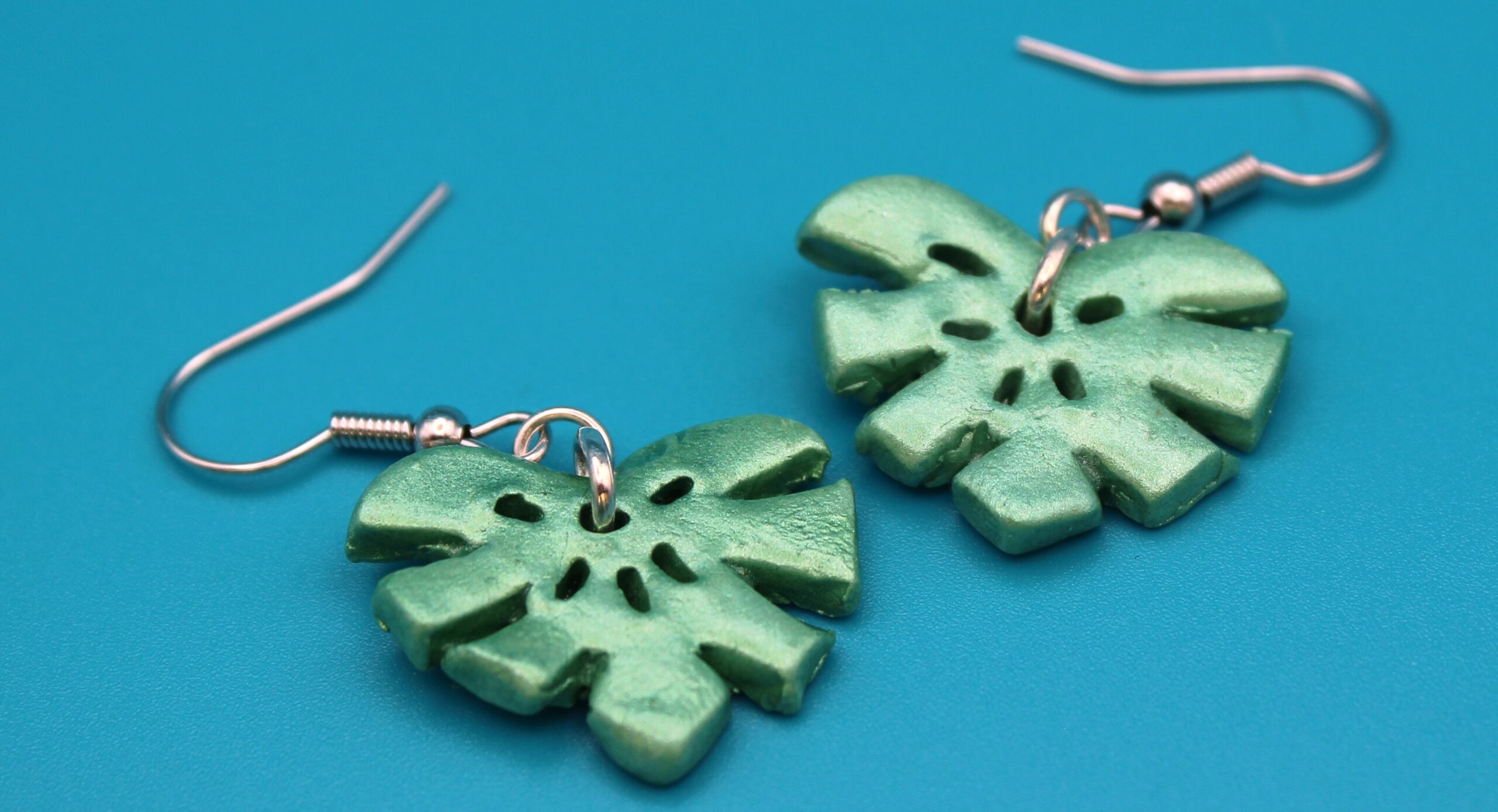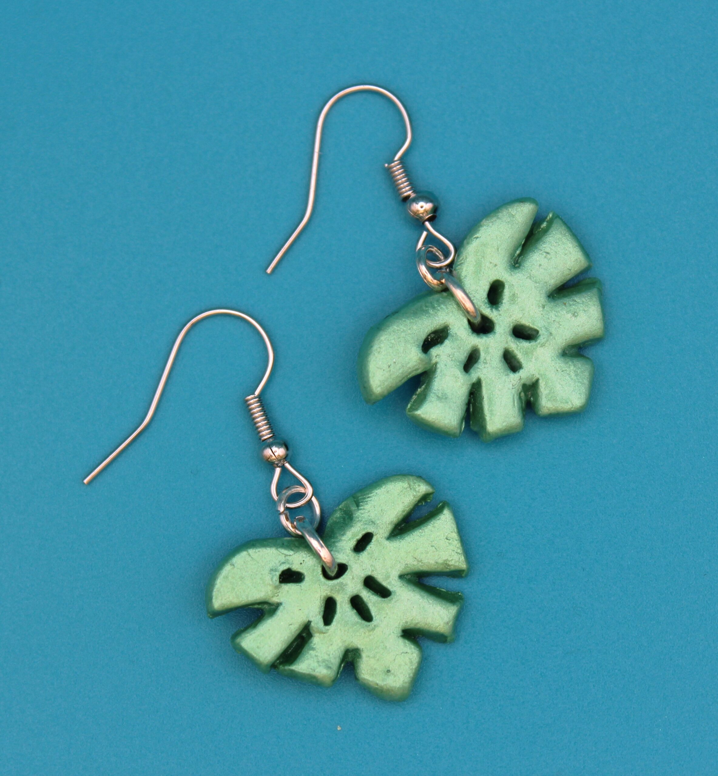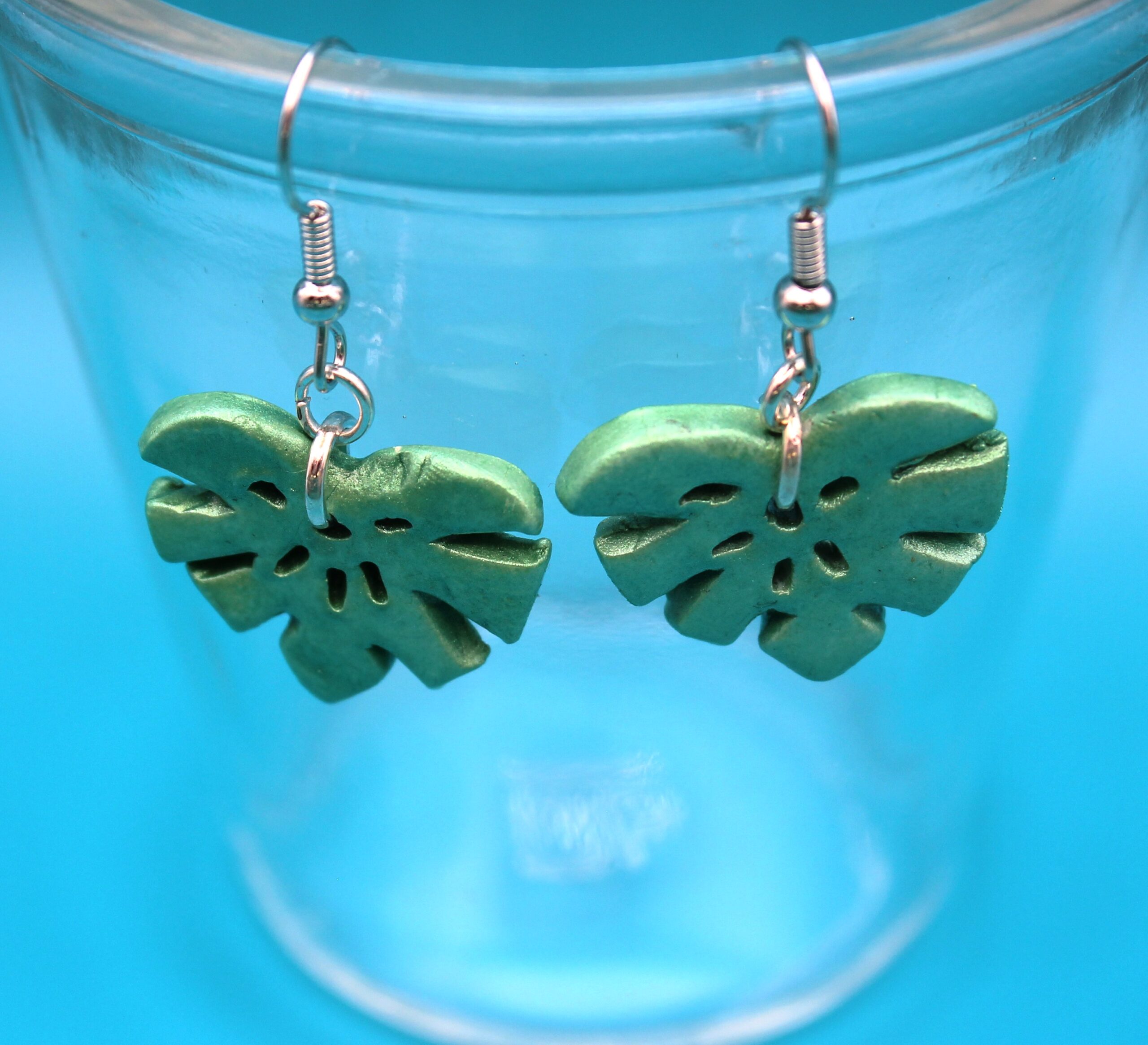 Whether you want to show off your love of house plants, or add a touch of natural elegance to your look, these shimmering dangle earrings are the perfect accessory! Each earring features one of the iconic leaves from the popular Monstera Deliciosa plant. Each item is handmade from polymer clay.